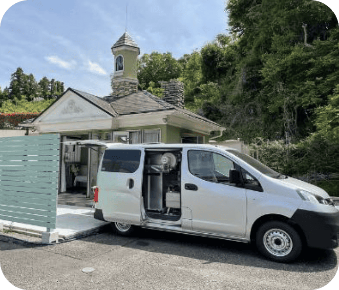 火葬車は、煙やダイオキシンなどが発生しない構造になっており、ご近所様にも配慮し看板などは掲げておりません。(ミニバンサイズの自動車が駐車できるスペースを必要とします。カーポート付き、ガレージ等の建物内の駐車場の場合はご利用できません。)